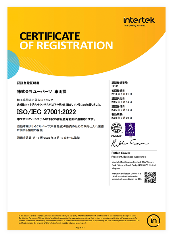 ユーパーツは、顧客の皆さまに安心して当社製品・サービスをご利用いただくため、地球環境保全および自動車リサイクル部品普及のため、ISO認証を取得しております。